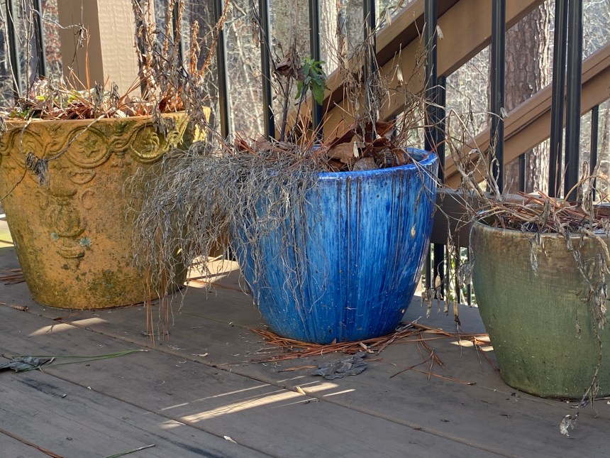 Atlanta has some wonderfully temperate winter days that are perfect for outdoor hardscape maintenance. Suggested projects could include: stain the deck, paint the porch, paint or touch up patio furniture and garden benches; clean out fountains and other water features, clean off outsides of container gardening pots. Plan these jobs for days when the forecast predicts temps that stay above freezing for a few days afterwards, so that paints and stains can fully dry.