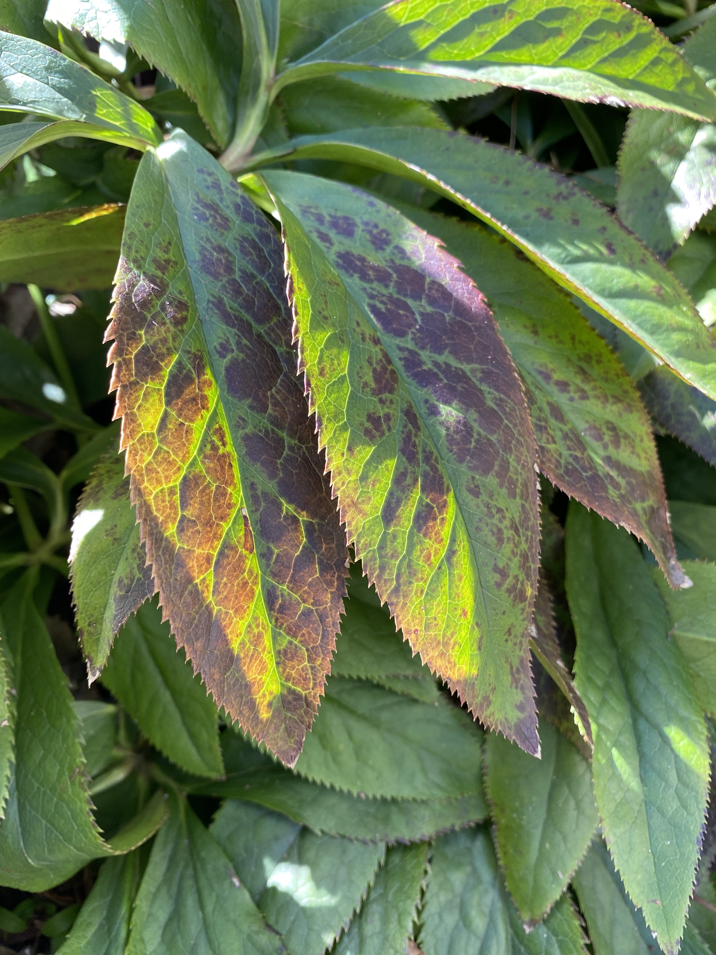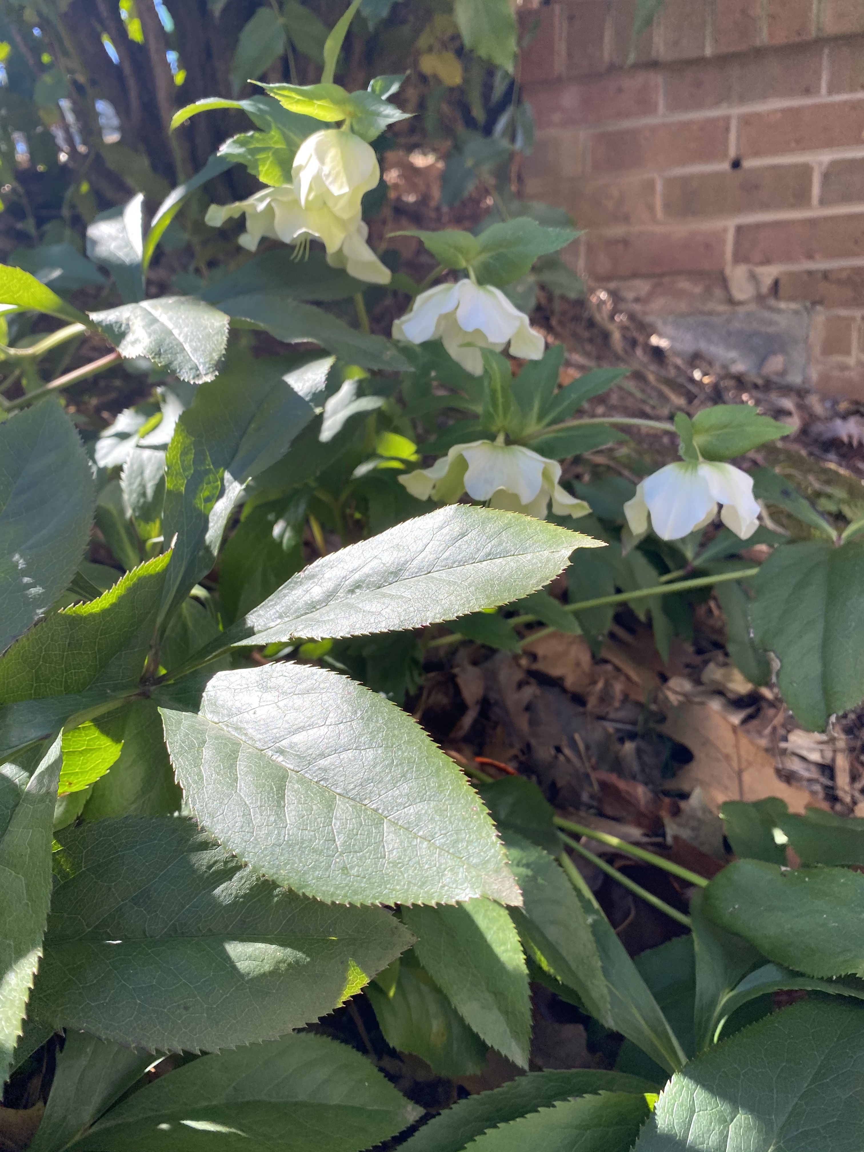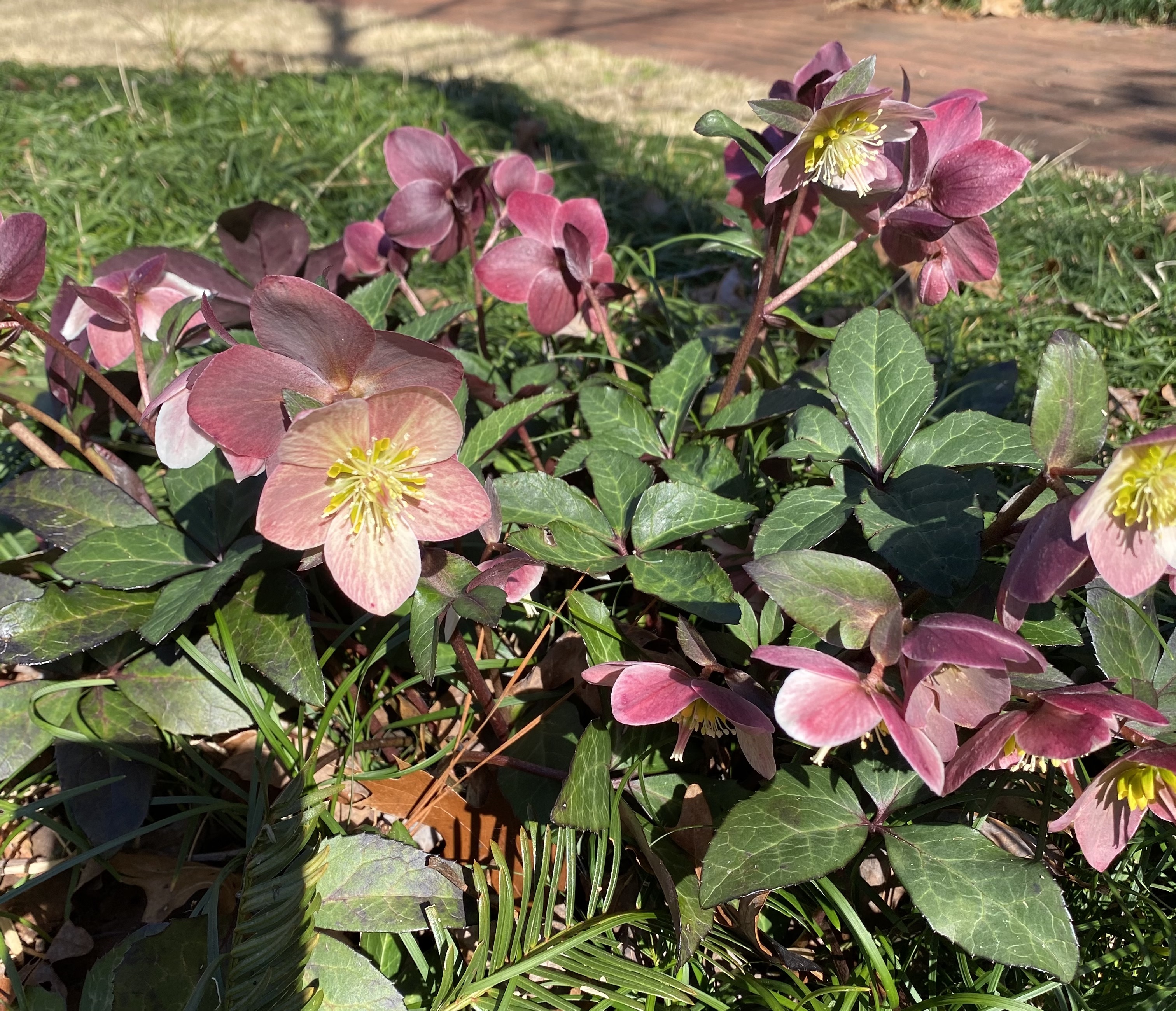 Hellebore / Lenten roses: cut back and clean out old tattered foliage so the flowers, which naturally droop downward, can be appreciated!