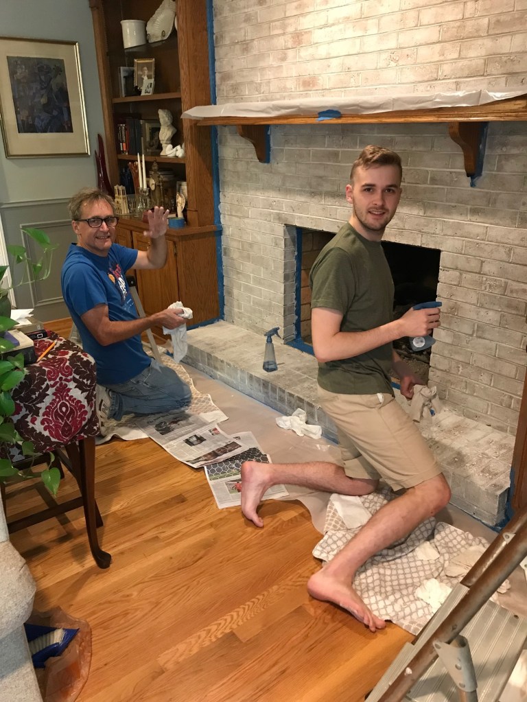 I was inspired by a few photos I found after Googling “painted brick fireplace” and settled on the limewash effect. We went with Romabio Avorio White Limewash Interior/Exterior Paint, which was in stock at Home Depot. I liked the limewash because it wasn’t going to completely cover the tones of the brick. Limewash paint gives a unique “whitewash” effect. The product we chose is a one-coat process, no priming required. That’s what sealed the whole deal for me.  According to the Romabio website this product is toxin free and environmentally friendly. Romabio Limewash is mineral-based and is derived from sustainable materials. . . . Bonus! And we were thrilled with the results!