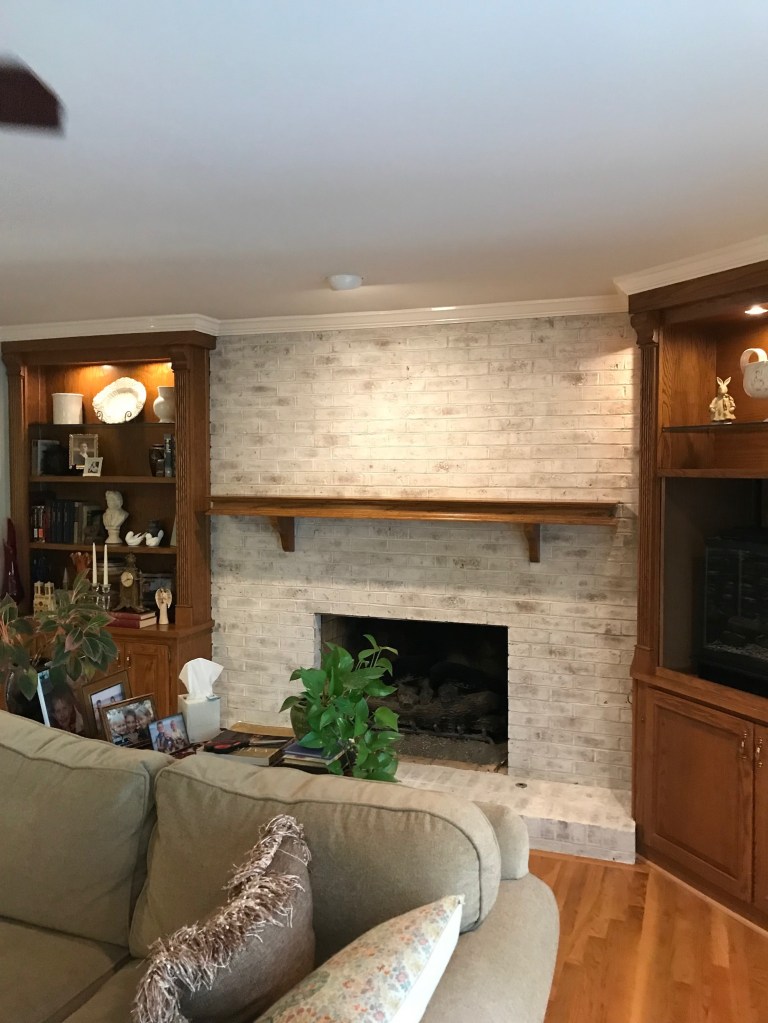 To my eye, the brick in our family room was a drab color, and while the surrounding oak bookcases were a great quality and of nice workmanship, I was tired of the heavy, honey-colored oak. That whole end of the room was dark.